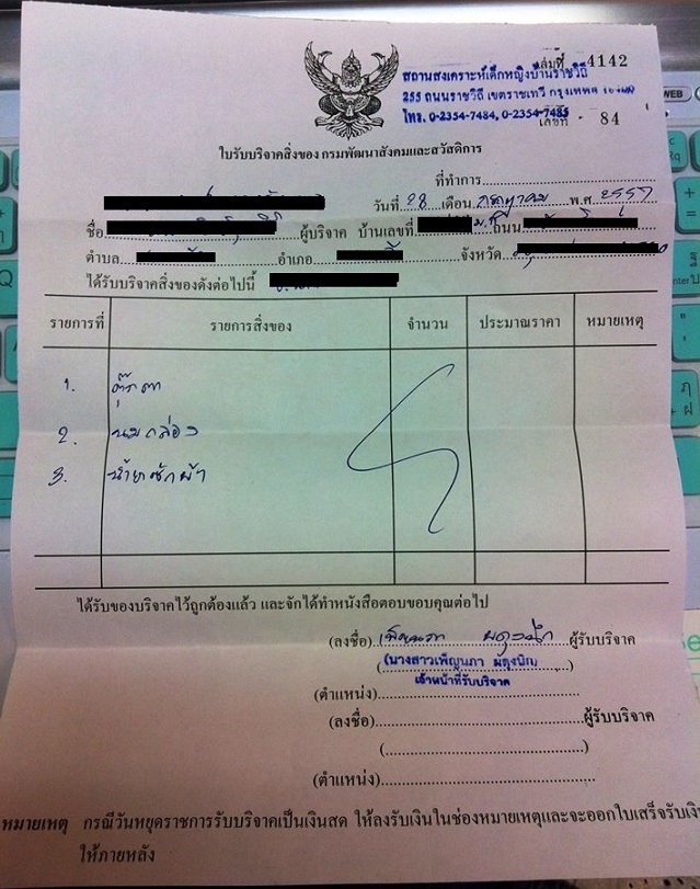 เรียบร้อยแล้วก็มาลงบันทึกการบริจาค เขียนชื่อ-ที่อยู่ แล้วก็ได้ใบรับบริจาคสิ่งของแบบนี้ค่ะ เป็นอันเสร็จกิจการบริจาค ^^