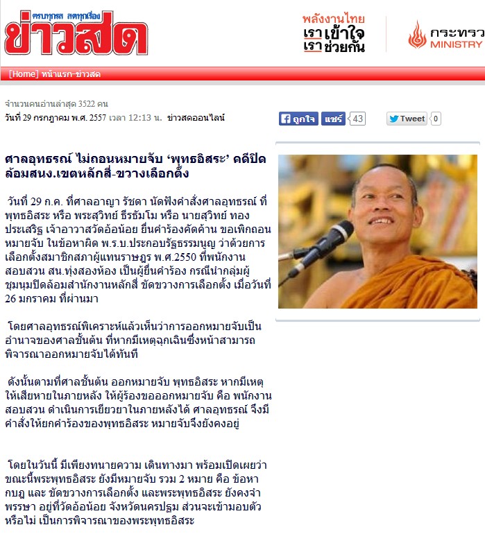 ศาลอุทธรณ์ ไม่ถอนหมายจับ ‘พุทธอิสระ’ คดีปิดล้อมสนง.เขตหลักสี่-ขวางเลือกตั้ง !