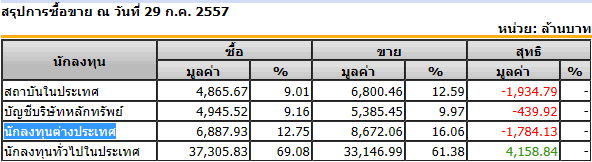 Sinthorn Summary 29/7/2557 : ต่างชาติขายสุทธิ -1,784.13 ลบ.