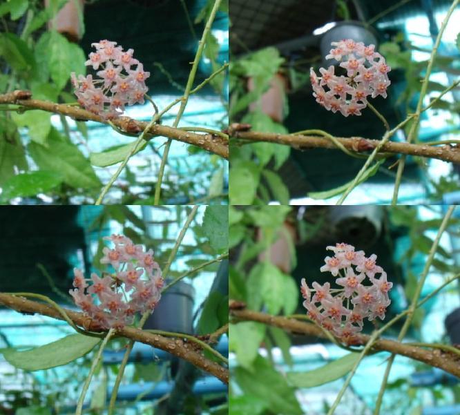 เมื่อคืน ไปเจอน้องพรม สีชมพู Canadian Sunset ของน้องปู สวยเต็มตา แบบนี้ต้องไปแสวงหา ไม่มีน้องพรม แต่มี Hoya imperialis เลื้อยขึ้นไปอยู่ บนต้นจำปา โชคดีที่ช่อดอกห้อยลงมา เลยเก็บภาพมาได้ เพื่อความสนุก
