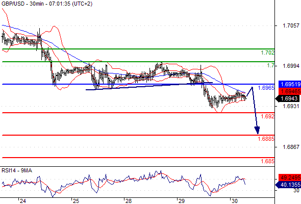 Our preference: Short positions below 1.6965 with targets @ 1.692 & 1.6885 in extension.