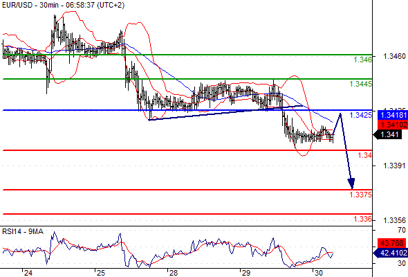 Our preference: Short positions below 1.3425 with targets @ 1.34 & 1.3375 in extension.