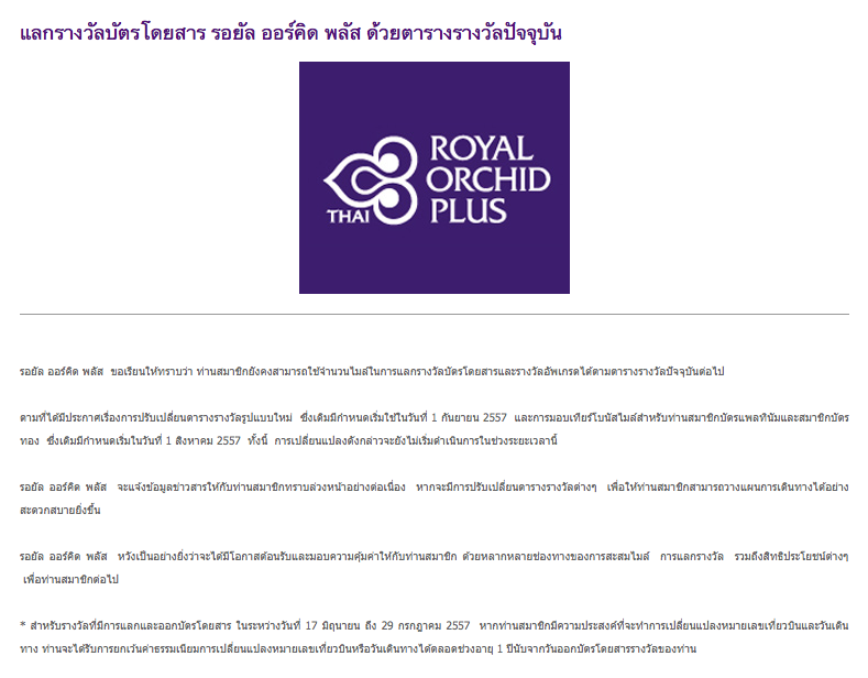 (ข่าวใหม่) แลกรางวัลบัตรโดยสาร รอยัล ออร์คิด พลัส ด้วยตารางรางวัลปัจจุบัน