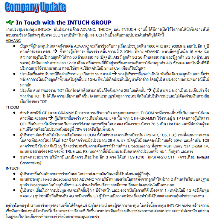 INTUCH: ประเด็นหลักจากการประชุมนักวิเคราะห์กับผู้บริหารกลุ่ม INTUCH