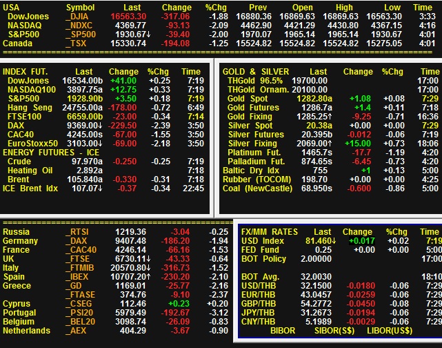 ดัชนีเฉลี่ยอุตสาหกรรมดาวโจนส์ปิดที่ 16,563.30 จุด ร่วงลง 317.06 จุด หรือ -1.88% ดัชนี NASDAQ ปิดที่ 4,369.77 จุด ลดลง 93.13 จุด หรือ -2.09% ดัชนี S&P500 ปิดที่ 1,930.67 จุด ลดลง 39.40 จุด หรือ -2.00%