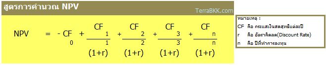 - NPV เป็นลบ แสดงว่า การลงทุนให้ผลขาดทุน ควรปฎิเสธการลงทุน