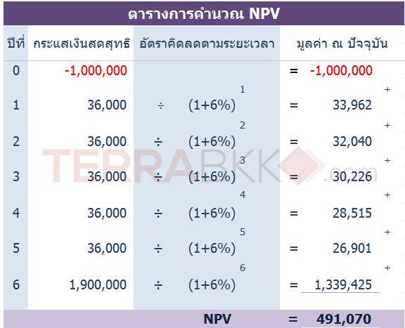 “การลงทุนสามารถสร้างผลกำไรได้จริงหรือไม่” นายจรวยจึงคำนวณหามูลค่าปัจจุบันของเงินสดสุทธิแต่ละปี ด้วยอัตราคิดลด (Discount Rate) เท่ากับต้นทุนทางการเงิน (อัตราดอกเบี้ยเงินกู้ 6%) เพื่อหาค่าNPV ใช้ประกอบการตัดสินใจ และพบว่า