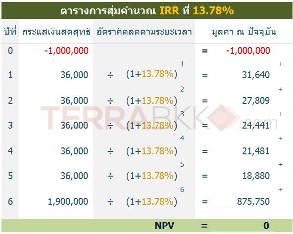 และเพื่อให้การตัดสินใจครั้งนี้เป็นไปอย่างรอบครอบยิ่งขึ้น นายจรวยจึงคำนวณหาค่า IRR เพื่อตรวจสอบว่า อัตราคิดลด (Discount Rate) ที่ทำให้ NPV มีค่าเท่ากับศูนย์ (มูลค่าปัจจุบันเงินสดสุทธิที่ได้รับในแต่ละปี เท่ากับ เงินลงทุนก้อนแรก)นั้น มีค่ามากกว่า ต้นทุนทางการเงิน (อัตราดอกเบี้ยเงินกู้ 6%) จริงหรือไม่ เพื่อสะท้อนว่า“การลงทุนสร้างผลตอบแทนได้กี่เปอร์เซนต์” ซึ่งพบว่าค่า IRR ที่ 13.78% ทำให้ค่า NPV เท่ากับศูนย์ และเป็นเปอร์เซนต์ผลตอบแทนที่มากกว่าต้นทุนทางการเงินด้วย
