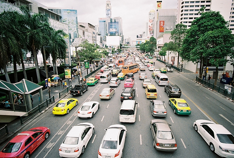 รถราขวักไขว่ ต้องข้ามด้วยสะพานลอย ขอบภาพบิดเบี้ยวด้วยดีสทอชั่นทำให้ลำตัวรถยนต์ยาวๆ แปลกตาดีเหมือนกัน