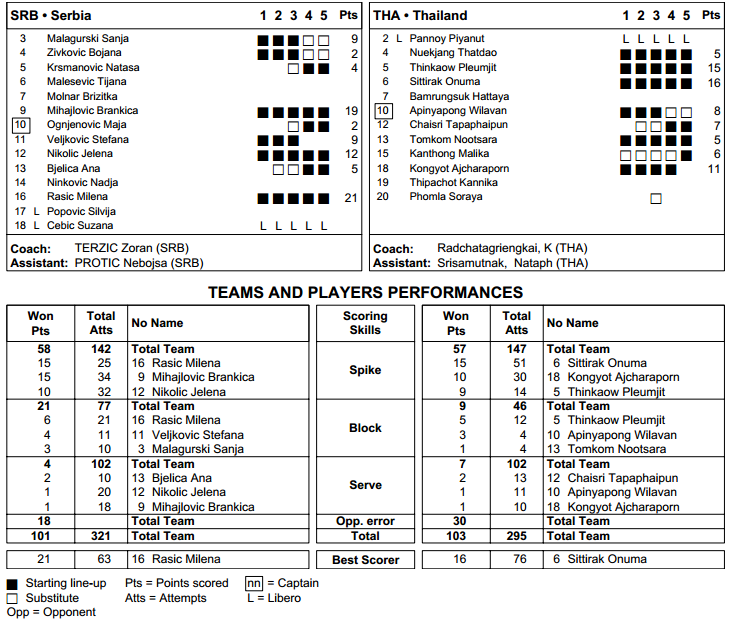 อร ตีดี set ที่ 1,4,5 เชื่อว่าโค้ช Serbia สั่งลูกทีมจับทางอรโดยเฉพาะแต่อรยังแก้ไขสถานการณ์ได้ดี จากที่แต่แรงก็เปลี่ยนเป็น ใส่ spin บอลให้มาก ตบเบาลงเพื่อที่ Serbia จะได้จับจังหวะยาก เล่นทิศทางมากขึ้น พยายามหลบซ้าย ขวา ซึ่งถือว่าทำได้ค่อนข้างดี
