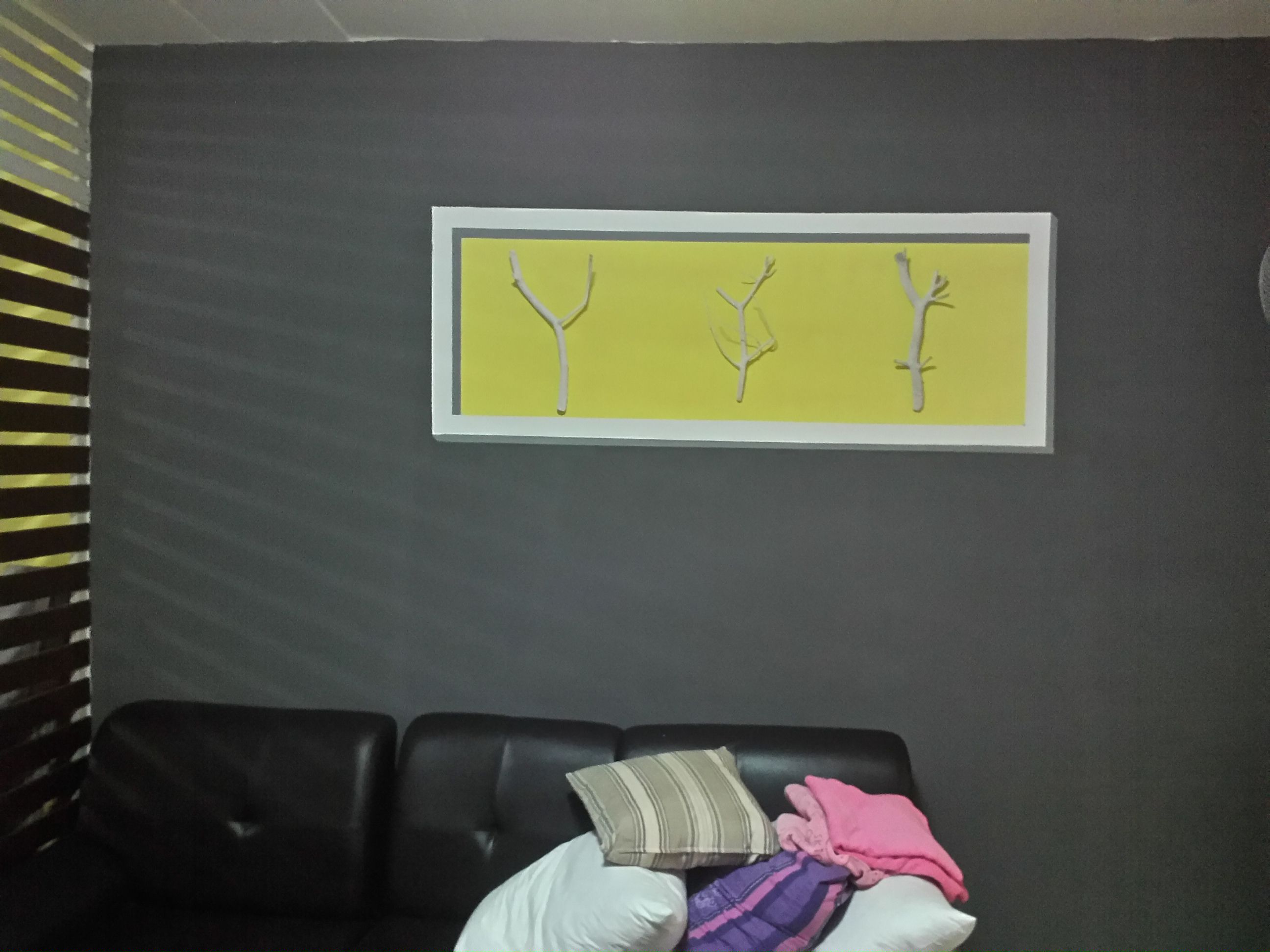 วาดกรอบรูปลงบนผนัง แล้วติดกิ่งไม้ที่ทาสีขาว ( ประหยัดสุดๆ )