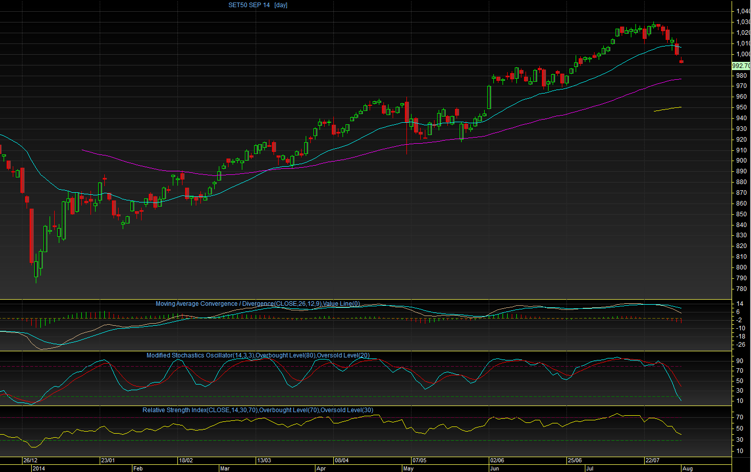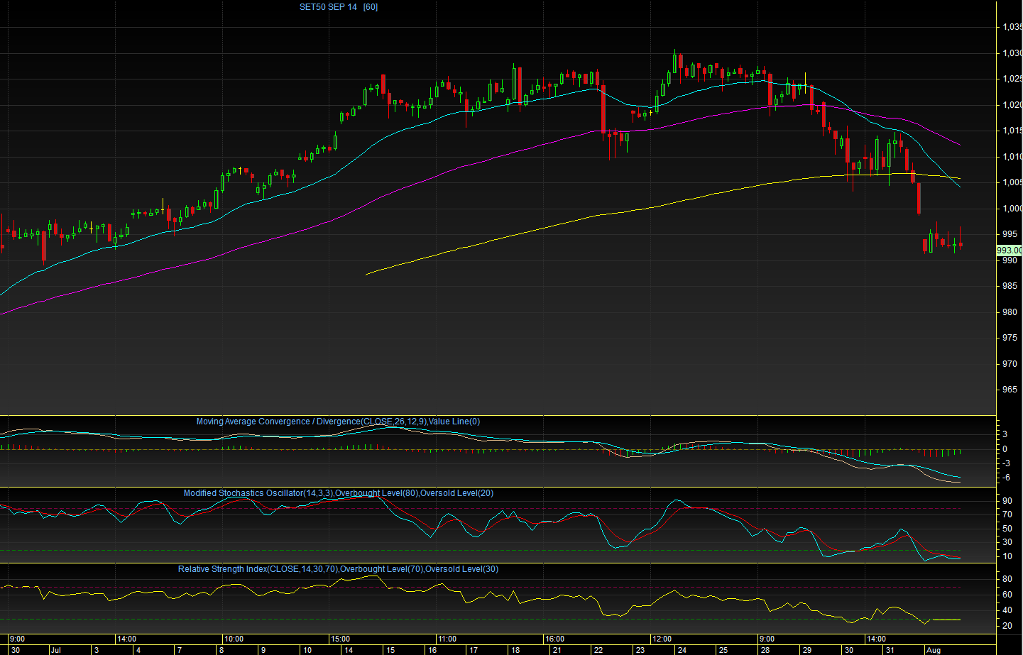 (991-997 จุด) ทำให้เกิดแท่งเทียน "Inverted Hammer" ซึ่งทำให้วันนี้ มีแนวโน้มที่จะ Rebound ขึ้นไป ทดสอบ 1000 จุด อีกครั้ง