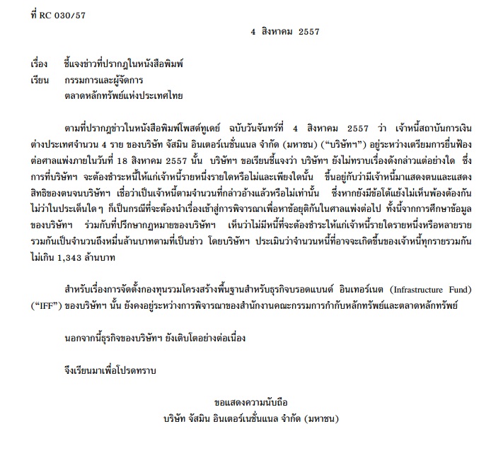 ผมอ่านแล้วงงครับ เหมือนผมจะเข้าใจว่ามีปัญหาฟ้องร้อง 2 เจ้า ผมเข้าใจถูกมะ ? 1.เจ้าหนี้ 4 ราย ซึ่งก็เหมือนบริษัทออกมาชี้แจงประเด็กนนี้แล้วว่าเต็มที่ก็น่าจะพันล้าน ไม่ใช่หมื่นล้าน 2.TT&T ฟ้องที่จะเอา