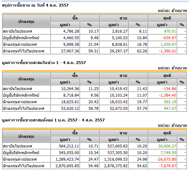 เว็บไซต์ตลาดหลักทรัพย์แห่งประเทศไทย รายงานสรุปการซื้อขายหลักทรัพย์ โดยแบ่ง ตามประเภทนักลงทุน ประจำวันที่ 23 เมษายน 2557 ดังนี้ กลุ่ม ปริมาณซื้อ % ปริมาณขาย % สุทธิ (ลบ.) (ลบ.) (ลบ.) นักลงทุนสถาบัน 4,