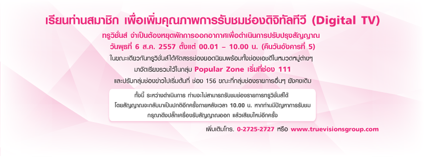 ทางทรูวิชันส์ได้โพสปรับปรุงสัญญาน ทีวีดิจิตอล เพื่อเพิ่มคุณภาพทีวีดิจิตอล จริงหรือป่าว คือประกาศมาแบบงงมาก ลองอ่านดูครับ เรียนท่านสมาชิก เพื่อเพิ่มคุณภาพการรับชมช่องดิจิทัลทีวี (Digital TV) ทรูวิชั่