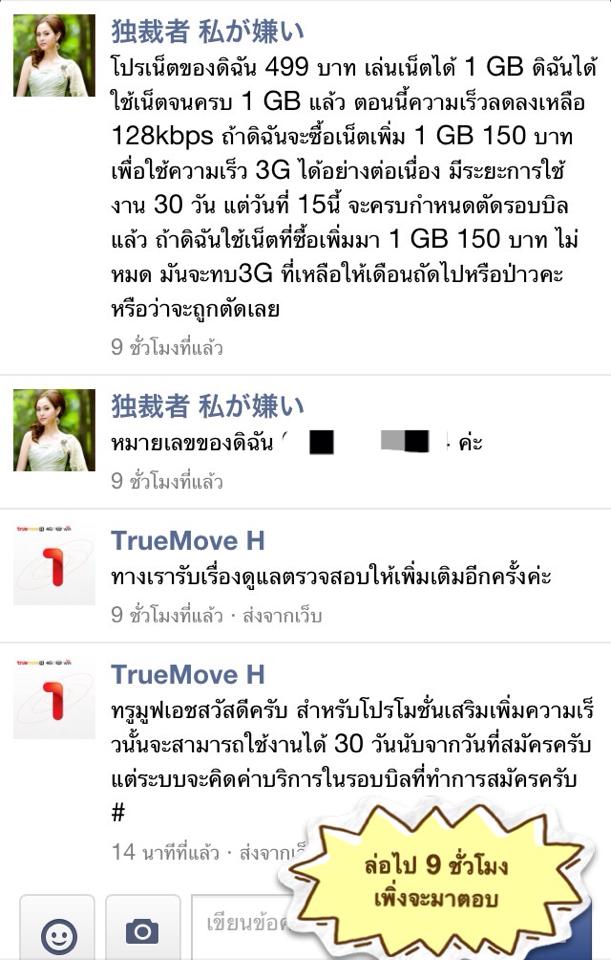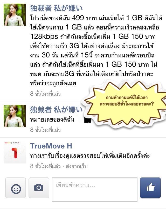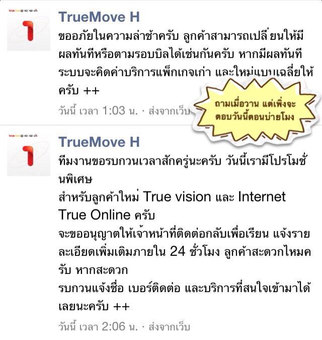 ดิฉันเคยโพสถามหน้าเพจ TrueMove H แต่ทรูหายยาวเลยค่ะ หลายชั่วโมงกว่าจะตอบ