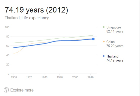จากกราฟ อายุขัยเฉลี่ยของคนไทยในช่วงปี 1970 คือ 60 ปี ในขณะที่ในปี 2012 อายุขัยเฉลี่ยคือ 74 ปี