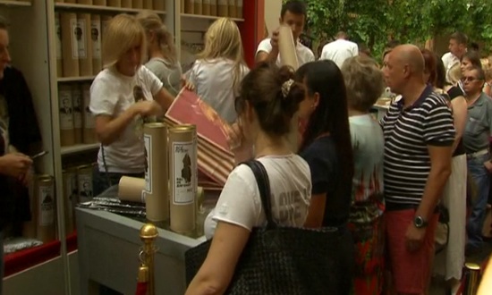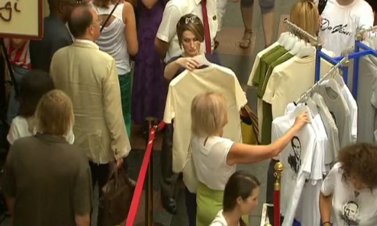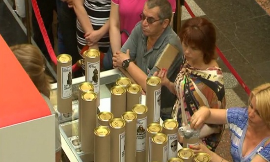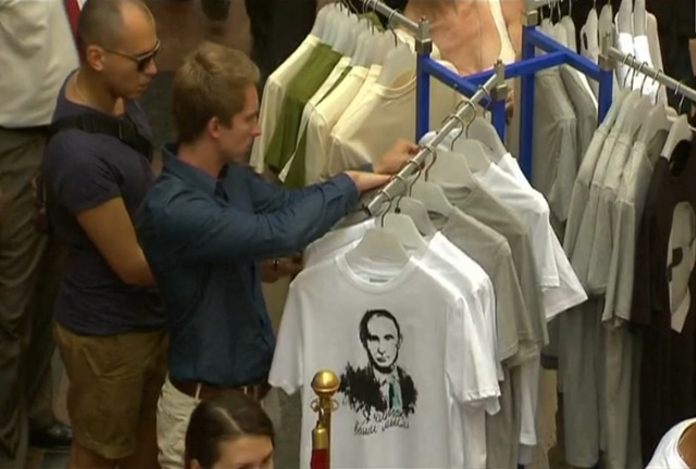 วันนี้(12ส.ค.57)ชาวรัสเซียในกรุงมอสโคว์ ยืนต่อคิวซื้อเสื้อยืดลายใบหน้าของประธานาธิบดี วลาดิเมียร์ ปูติน เมื่อวันจันทร์