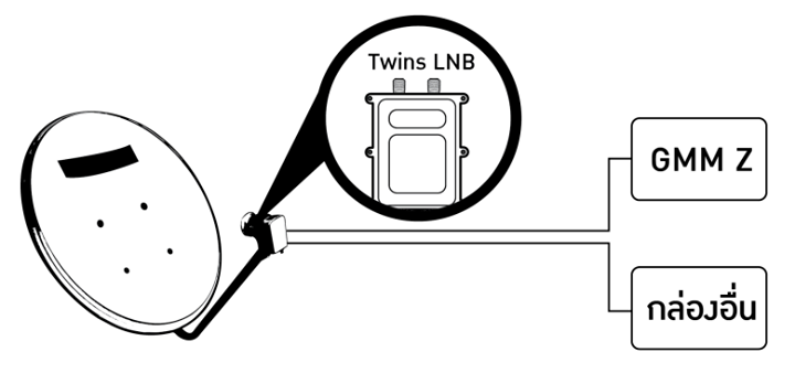 กรณีที่1: หากต้องการรับชม 2 กล่อง ท่านต้องเปลี่ยนหัวรับสัญญาณ LNB เป็นแบบ 2 ขั้ว (TWINS LNB) แล้วจึงต่อสายแยกเข้าแต่ละกล่อง