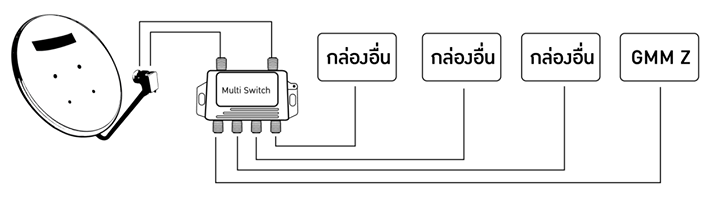 กรณีที่2: หากต้องการรับชมมากกว่า 2 กล่อง ท่านต้องเปลี่ยนหัวรับสัญญาณ LNB เป็นแบบ 2 ขั้ว (TWINS LNB) จากนั้นต่อเข้ากับ “MultiSwitch” ก่อนแยกแต่ละสายเข้าแต่ละกล่อง