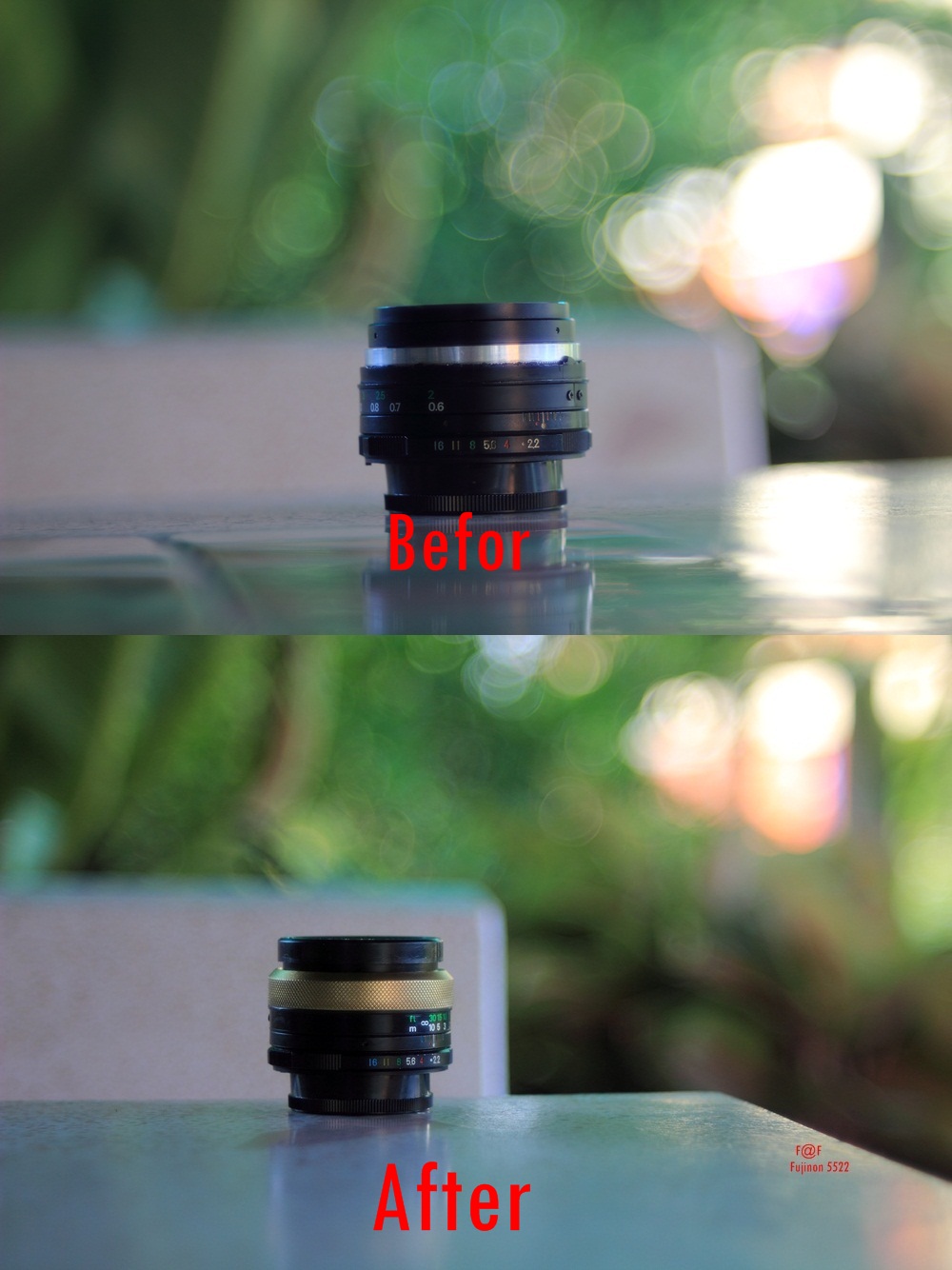 เลนส์ตัวนี้น้าๆ ปร้า ๆ คงรู้จักดี เขามีเอกลักษณ์อีกอย่างคือแหวนแตก บางคนก็ชอบเห็นว่าขลังดีและเป็นของแท้ ฮะๆๆ แต่ผมมีหลายตัวเลยขอเอาไปเสริมหล่อนิดนึง จะได้อยู่กับเราไปนาน ๆ ว่าแล้วก็ส่งไปสำนักมาร แถวรังสิตเลยครับ จัดการกลึงทองเหลืองใส่ซะเลย ออกมาได้ประมาณนี้ครับ