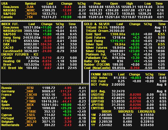 นอกจากนี้ นักลงทุนยังจับตาดูข้อมูลเศรษฐกิจที่สำคัญของสหรัฐในวันนี้ โดยในเวลา 19.30 น.ตามเวลาไทย สหรัฐจะเปิดเผยยอดค้าปลีกเดือนก.ค. และจากนั้นในเวลา 21.00 น.ตามเวลาไทย สหรัฐจะเปิดเผยสต็อกสินค้าคงคลังภาคธุรกิจเดือนมิ.ย.