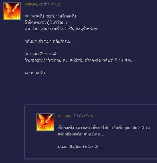 สมาชิกหมายเลข 1634331 คุณtinthong ฝากแจ้งข่าว ติดธุระ