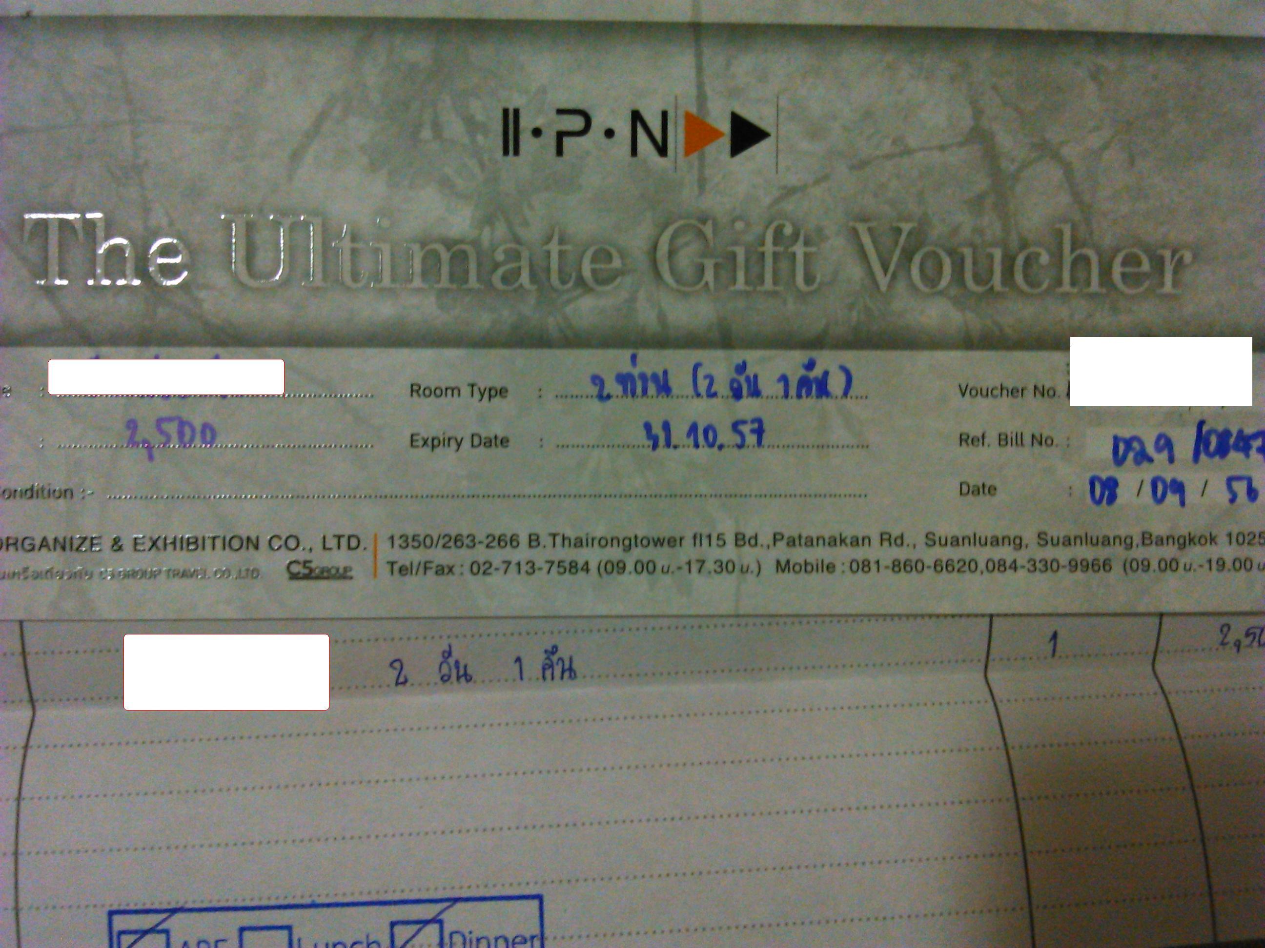 ขอย้อนอดีตไปเมื่อวันที่ 8 กันยายน 2556 จขกท. ไปเดินงาน "ไทยเที่ยวไทย ไม่ไปไม่รู้นะเนี่ย" ทีศูนย์ประชุมสิริกิต์ แล้วไปซื้อแพกเกจที่พัก กับบริษัทที่มีชื่อเสียดังมากในนี้ (ไม่รู้เป็นไรช่วงนี้ชอบพิมพ์ตัวอักษรตกๆ หล่นๆ) ขออนุญาตไม่เอ่ยนามละกันนะครับ เดี๋ยวเค้าจะเสียหาย (ไม่เอ่ยนามนะฮะ โปรดดูรูปประกอบ)