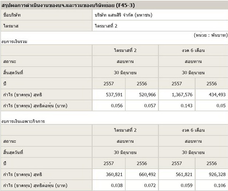 งบการเงิน SIRI ไตรมาสที่ 2/2557