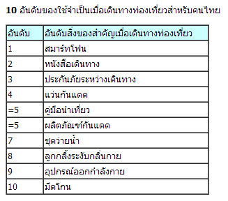 ผลสำรวจจากโฮเทลส์ ดอทคอมยังรายงาน 10 อันดับของใช้ที่จำเป็นสำหรับการท่องเที่ยวซึ่งพบว่าสมาร์ทโฟนคือสื่งที่นักท่องเที่ยวคนไทยให้ความสำคัญเป็นอันดับหนึ่ง ตามมาด้วยหนังสือเดินทางและประกันภัยระหว่างเดินทาง และแว่นกันแดดเป็นอันดับ 3 ขณะที่อันดับ10เป็นมีดโกน