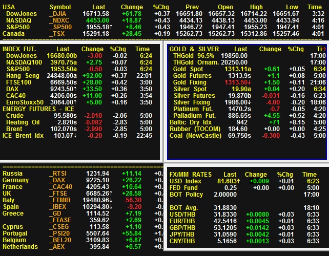 ตลาดหุ้นสหรัฐฯปิดการซื้อขายวันที่ 14 ส.ค. ในแดนบวก โดยดัชนีดาวโจนส์เพิ่มขึ้น 61.78 จุด หรือ 0.37% ปิดที่ 16713.58 จุด ส่วนดัชนีเอสแอนด์พี 500 เพ่ิมขึ้น 8.46 จุด หรือ 0.43% ปิดที่ 1955.18 จุด ขณะที่ดัชนีแนสแด็กเพิ่มขึ้น 18.87 จุด หรือ 0.43% ปิดที่ 4453.00 จุด