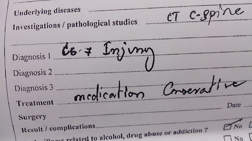 คือผมประสบอุบัติเหตุมอเตอร์ไซด์ หลังจากเข้าโรงพยาบาลเป็นรอบที่2 คุณหมอให้ทำ CT-scan อีกครั้ง และพบว่าบริเวณกระดูกคอข้อที่6-7มีการฉีกขาด หมอให้ผ่าตัด แต่ค่าใช้จ่ายสูงมาก ผมเลยเลือกไม่ผ่า แต่ใส่ SOMI Brace เป็นเวลา2เดือนดูก่อน ถ้าทุกอย่างดูดี ก็ไม่ต้องผ่าตัดครับ