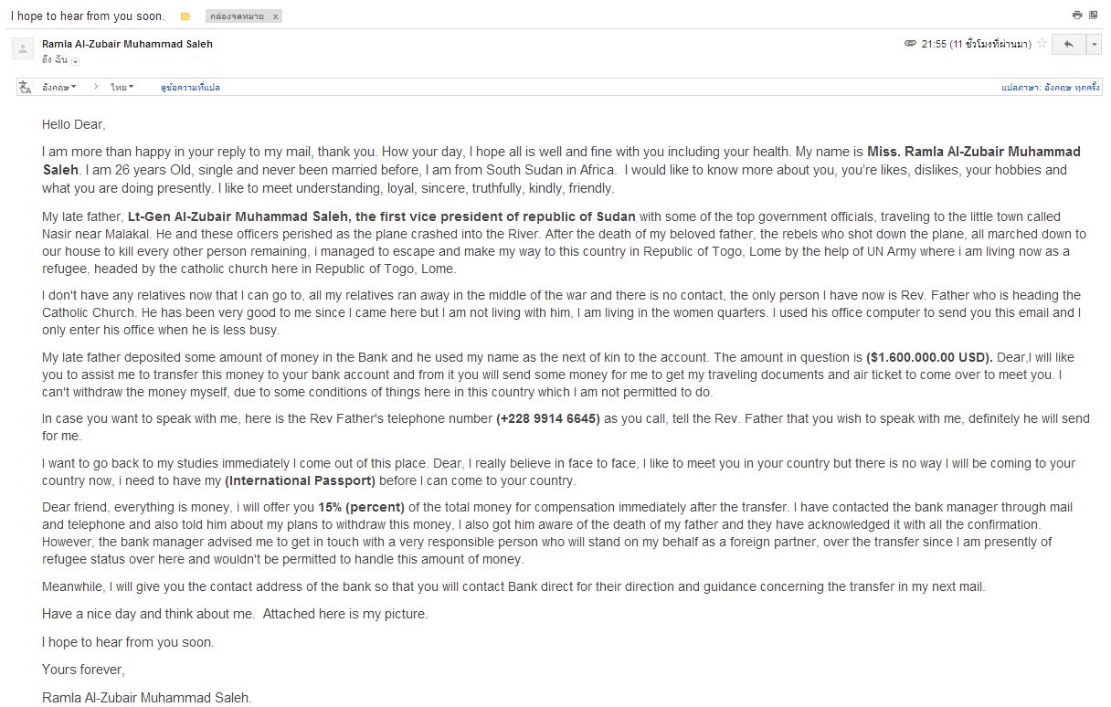 ตอนแรกผมอ่านไปอ่านมาก็นึกว่าอยากจะมาเล่าเรื่องให้ฟัง ที่ไหนได้หลอกให้โอนเงิน (เซ็ง...) ดีที่ผมได้เคยอ่านอีเมล์ประมาณนี้มาบ้างเลยรู้แนวว่าเขาจะหลอกเรายังไง