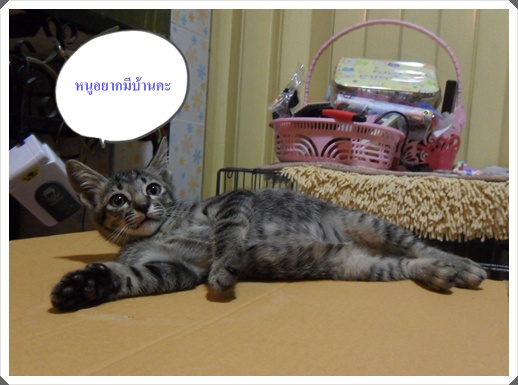 จากกระทู้เดิม http://pantip.com/topic/34727075 ขอหาบ้านที่ปลอดภัยให้ลูกแมว 1 ตัว (ตัวสุดท้ายของครอกนี้) เพศเมีย อายุประมาณ 2 เดือนนิด ๆ ถ่ายพยาธิแล้ว พิกัด :: ซอยรามคำแหง 68 (ซอยย่อยในหมู่บ้านกิตติน