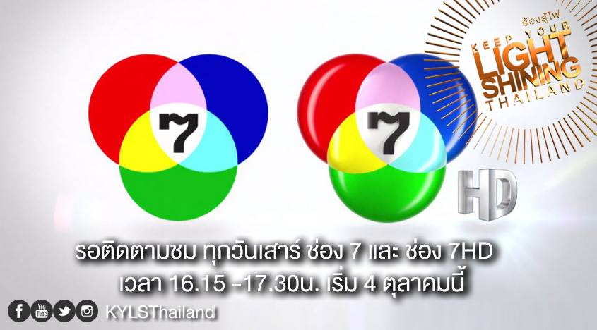 “KEEP YOUR LIGHT SHINING” รายการประกวดร้องเพลงฟอร์แมทอินเตอร์ล่าสุดจากยุโรปที่ได้รับการกล่าวขานว่าตื่นเต้นและเข้มข้นที่สุดเท่าที่เคยมีมา ซึ่งกำลังได้รับความนิยมและเป็นที่ต้องการมากกว่า 20 ประเทศทั่วโลกกำลังจะผลิตในประเทศไทย ภายใต้ชื่อ“ร้องสู้ไฟ KEEP YOUR LIGHT SHINING THAILAND” พร้อมออกอากาศเร็วๆ นี้ ทางช่อง 7 ทั้งแบบปกติและ HD