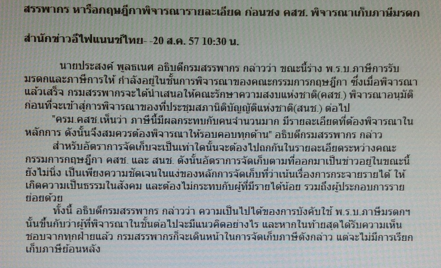 @@@ มุมกาแฟNONแดง(มุมนี้ไม่มีใครเป็นเสื้อแดง) พุธที่5/11/2014 คลังเล็งส่งร่างภาษีมรดก เข้าครม. 11พย.นี้ @@@