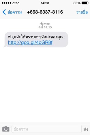 มีข้อความส่งเข้ามาว่าแจ้งให้ทราบการจัดส่งของคุณข้อความส่งมาได้ยังไงคะ (มีรูป)