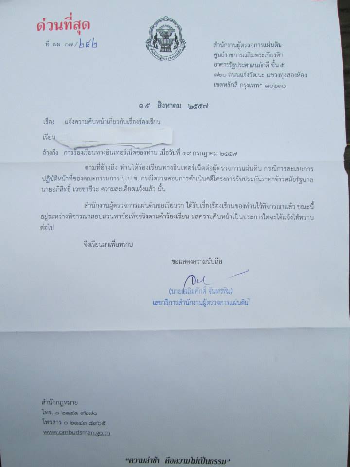 เมื่อวันก่อนได้มีหนังสือจากสำนักงานผู้ตรวจการแผ่นดินส่งมา ถึงเรื่องให้ตรวจสอบการทำหน้าที่ของคณะกรรมการ ป.ป.ช. ในเรื่องคดีประกันราคาข้าว สมัยรัฐบาลนายอภิสิทธิ์ เวชชาชีวะ ถ้าหากมีความคืบหน้าจะมาแจงให้ทราบต่อไป