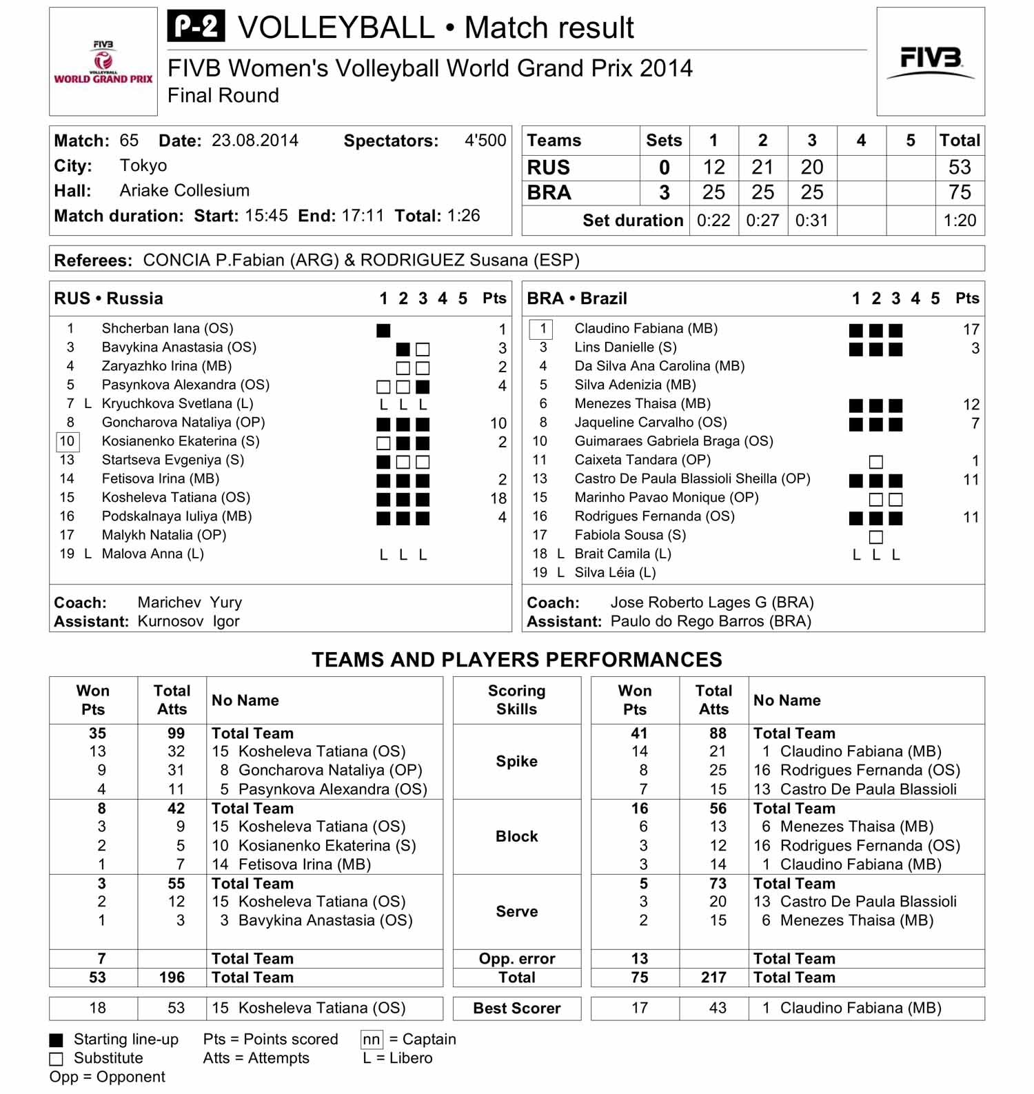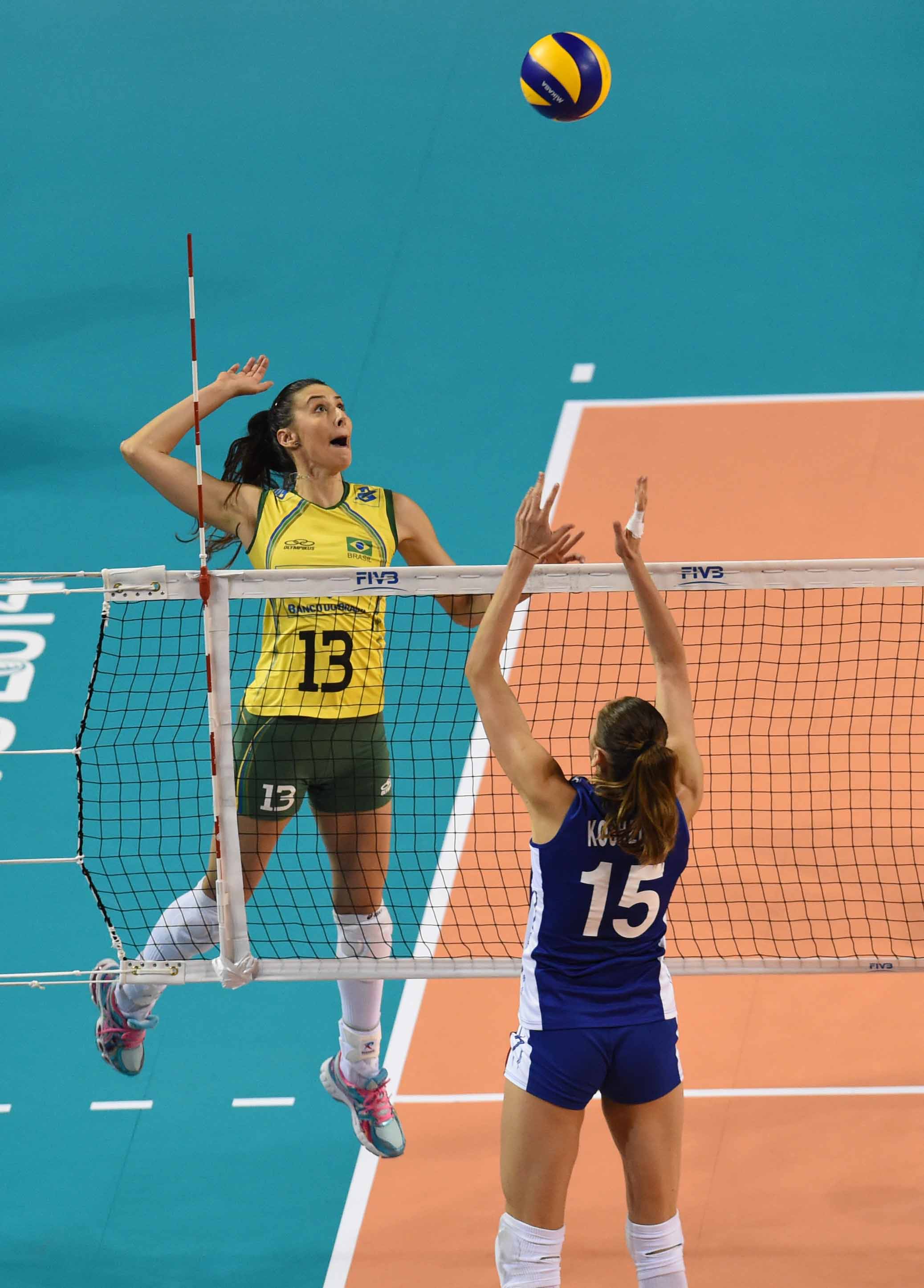 • Fabiana Claudino was the top scorer for Brazil with 17 points; Tatiana Kosheleva led Russia with 18 points. Brazil outscored Russia in blocking points 16-8, with Thaisa Menezes getting six.