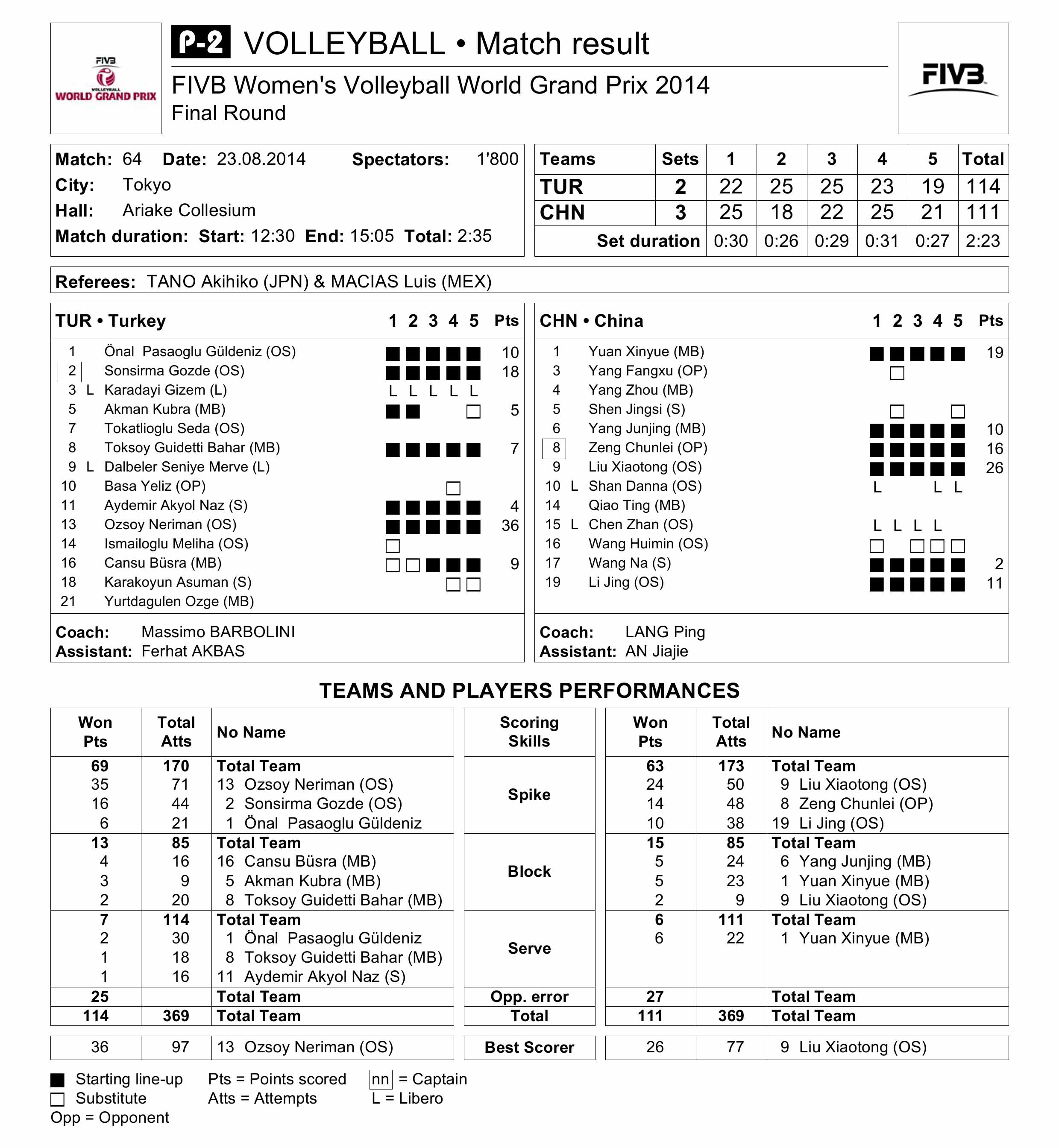• Neriman Ozsoy was the top scorer in the match with 36 points; Liu Xiaotong led China with 26. Yuan Xinyue scored all six of China's service points.