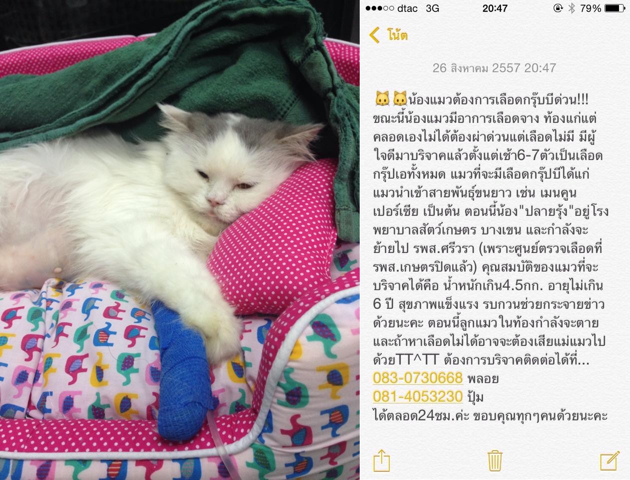 สวัสดีค่ะพี่ชายฝากมาอีกค่ะ อันนี้เป็นแมวของเพื่อนพี่ชายอีกทีนะคะ แมวเปอร์เซียแท้ ชื่อปลายรุ่ง คลอดลูกเองไม่ได้ ต้องผ่าคลอด ตอนนี้คลอดออกมาแล้ว แต่ต้องการเลือดด่วน เพราะเสียเลือดมาก ตอนนี้ยังไม่ได้เลื