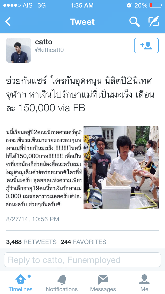 @kitticatt0: ช่วยกันแชร์ ใครกันอุดหนุน นิสิตปี2นิเทศจุฬาฯ หาเงินไปรักษาแม่ที่เป็นมะเร็ง เดือนละ 150,000 via FB