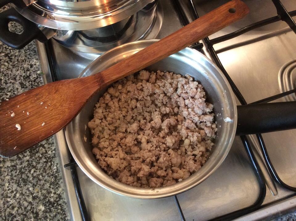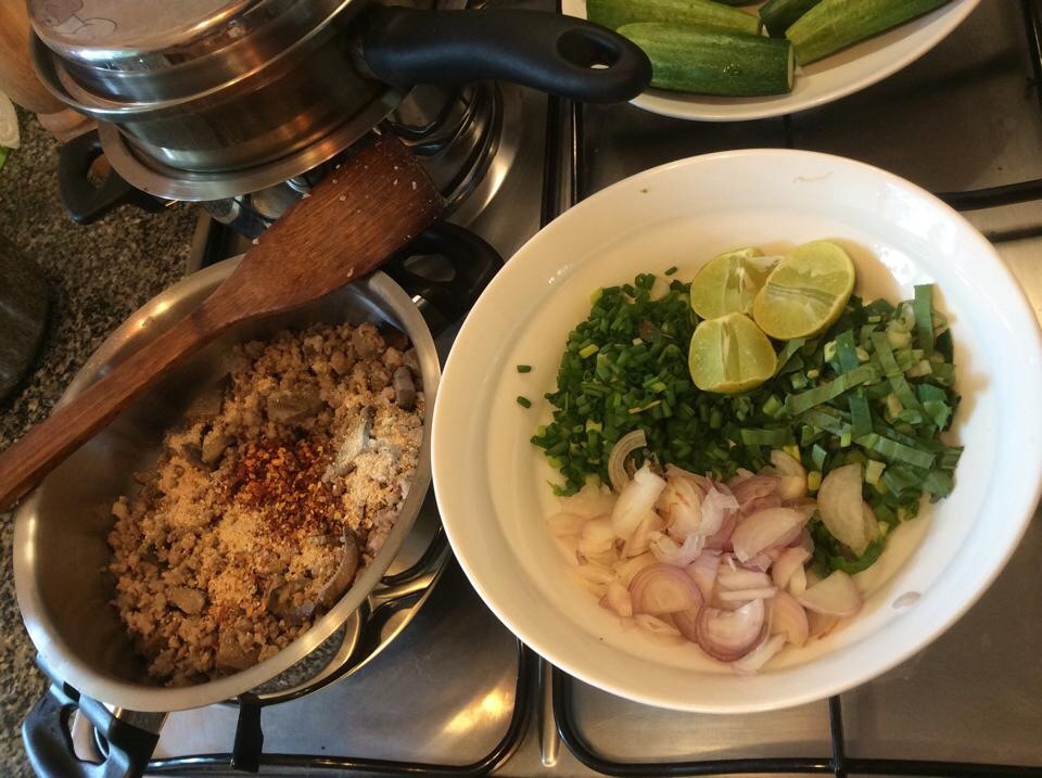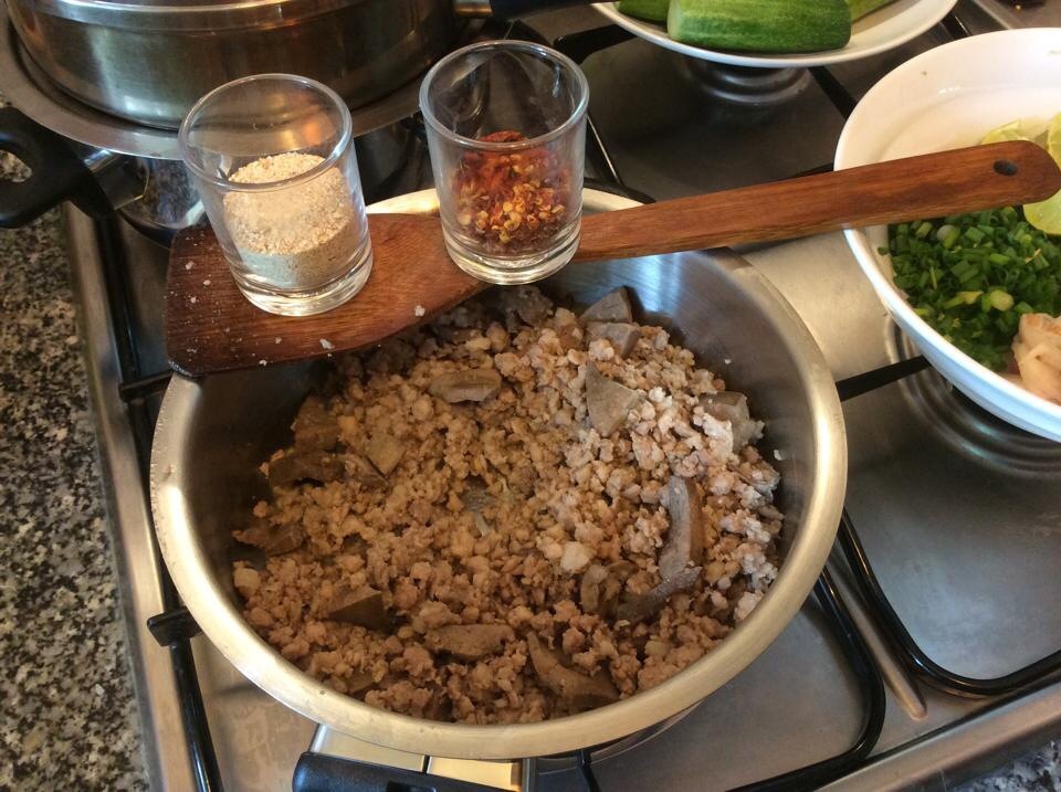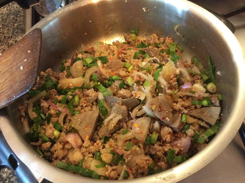 เสร็จจากตับ มาดูหมูกันค่ะ เราจะทำลาบแห้งๆ ไม่เอาลาบที่เจิ่งนองไปด้วยน้ำ ดังนั้น ตอนทำหมูให้สุก ใส่น้ำแต่นิดเดียวพอ กะเอาว่าพอหมูสุกปุ๊บ น้ำแห้งพอดีปั๊บ ถ้าไม่แห้งทำไงอ่ะ ? กั้นกระสอบทรายแล้วสูบออกค่ะ !!!! (ใส่น้ำปลาและซอสปรุงรสเล็กน้อยค่ะ)