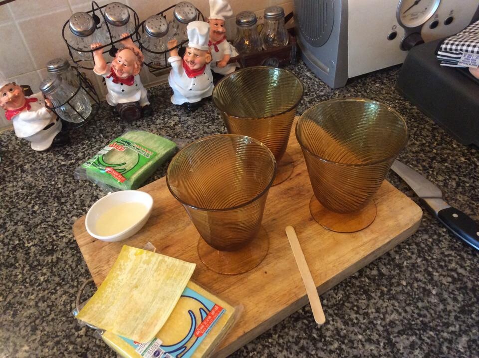 ให้นำน้ำมันทาบางๆตรงก้นแก้ว หรือถ้ามีสเปร์น้ำมันก็ใช้ได้เลย เพื่อไม่ให้เกี๊ยวติดแก้วค่ะ ย้ำว่าทาบางๆนะคะ เสร็จแล้ววางแผ่นเกี๊ยวลงไป ให้ห่อเป็นถ้วยเล็กๆ ตามรูปเลยค่ะ ใช้ไม้ไอติมหรือไม้ปลายมนๆ ช่วยจัดทรงนิดนึง