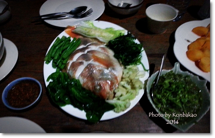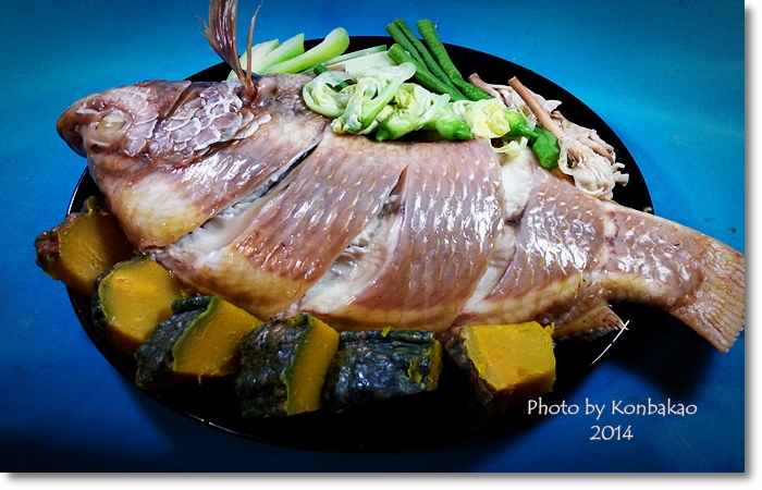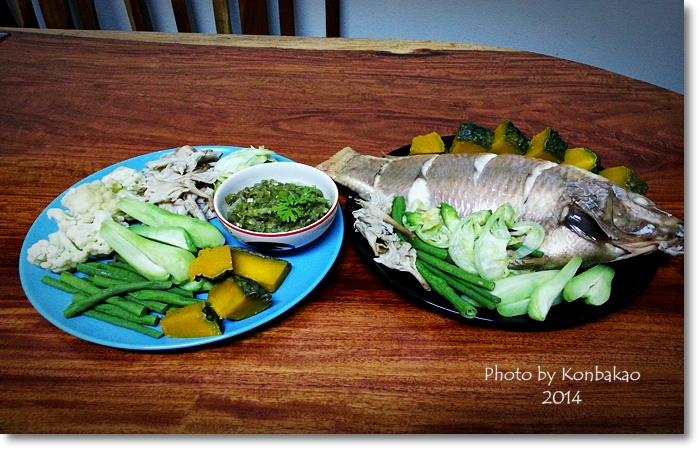 ประมาณ 15 นาที ปลาก็สุกตามมา ผักนึ่งล้นจานถือโอกาสเอามาประดับให้ดูดีเสียเลย