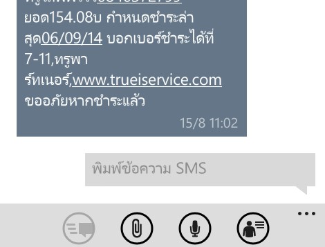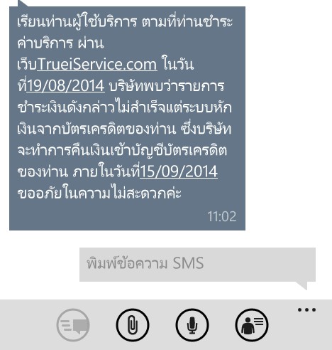 ผมก็ไม่รู้ว่าเป็นค่าบริการของอะไร เพราะใช้บริการทั้งจานแดงแล้วก็เบอร์โทร ก็เลยคิดว่าจะจ่ายค่าบริการส่วนนี้ก่อน เลยลองเข้าไปดูข้อมูลที่ TrueiService ก็พบว่ามียอดค้างชำระขึ้นมา 154.08 บาทจริง ผมเลยเลอกที่จะลองจ่ายเงินผ่านบัตรเครดิตตทางช่องทางของ TrueiService ดู ว่าได้หรือเปล่า เพราะชอบทำไม่สำเร็จ ก็ปรากฏว่าทำได้สำเร็จ แต่พอเวลาผ่านไป มาถึงวันนี้ มีข้อความเข้ามาอีกตามนี้ครับ
