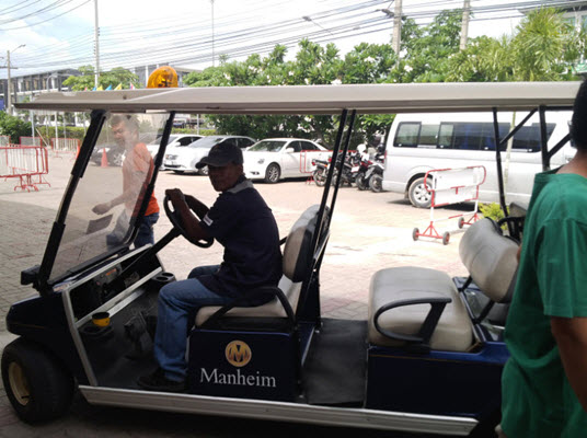 จอดรถปุ๊บก็มีรถกอลฟ์ รับส่งไปที่ลานประมูล ไม่ต้องเดินให้เมื่อย ที่จริงก็ไม่ไกลมาครับ แต่ร้อนโฮกเลย ตอนไปถึงคนเริ่มมากันแล้ว ขนาดว่าไปเช้าแล้วนะเนี่ย ไปสายจอดไกลแน่ๆ แต่ใครจอดไกลไม่ต้องห่วงเค้ามีรถมารับส่ง