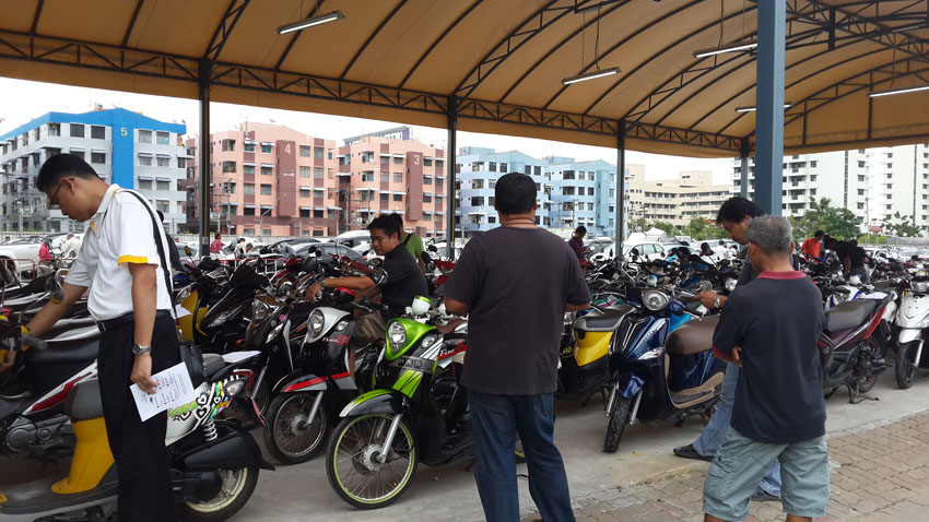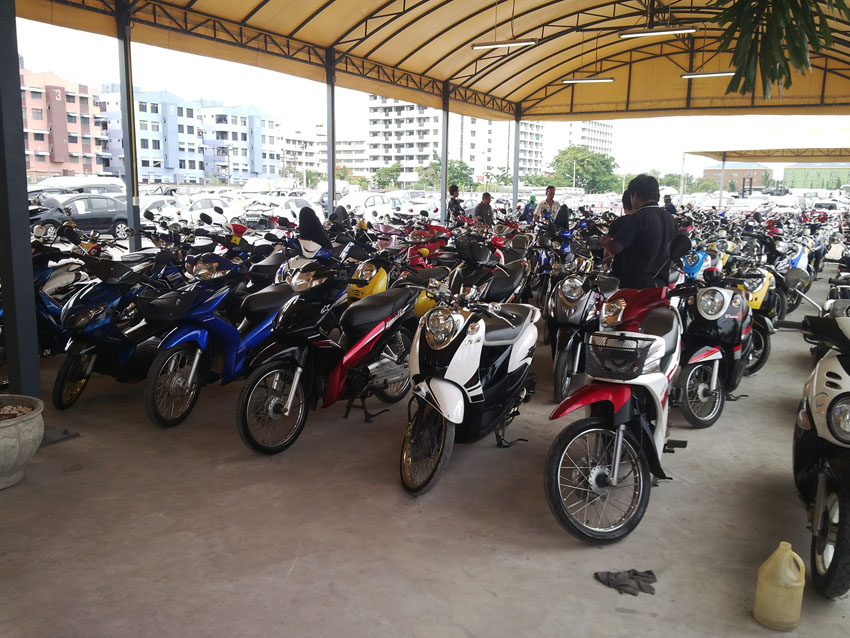 ลานประมูลมอเตอร์ไซค์อยู่ข้างหน้าสุดเลย มีทั้งหมด 5 ลานครับ ลานที่ 1-3 เป็นประมูลรถ รถกระบะ รถที่ใช้งานได้ทั่วไปอ่ะครับ ส่วนลาน 4 เป็นรถประสบอุบัติเหตุ และ 5 เป็นมอเตอร์ไซค์ ทุกลานเริ่ม 10 โมงพร้อมกัน