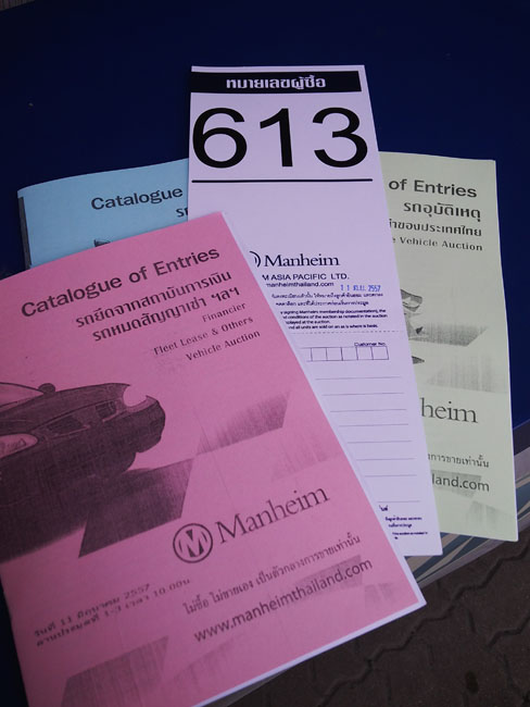 ได้เลขเด็ดมาแล้ว! กับหนังสือสามเล่ม เป็นรายการรถที่มาประมูล อันนี้หยิบมาถ่ายเฉยๆ เพราะมีทั้งรถปกติ , รถอุบัติเหตุ และมอไซค์ครับ วันนี้เล็งรถใช้งานอย่างเดียวครับ ที่ไปวันนั้นมีรถให้ประมูล 400 กว่าคัน! ตอนแรกแปลกใจ ทำไมไม่มีราคาตั้ง ยังไงลองอ่านไปเรื่อยๆ ครับ มีเฉลย