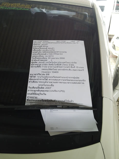 เห็นกระดาษขาวๆ เป็นรายละเอียด พวกปีจดทะเบียน เลขเครื่อง-ตัวถัง แล้วก็บอกอุปกรณ์รถส่วนหลักๆ ว่าใช้ได้รึป่าว